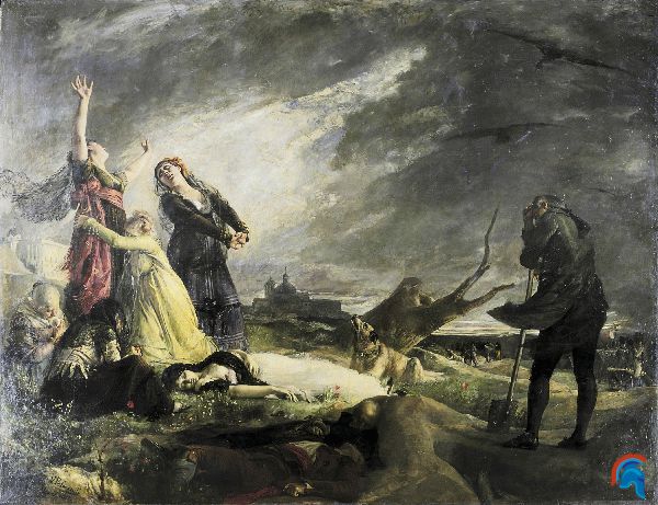 Source: img.rutasconhistoria.es Los que han muerto, aparecen apilados en primer plano, sobre sangre que llama la atención por su intenso color rojo, frente al ocre.